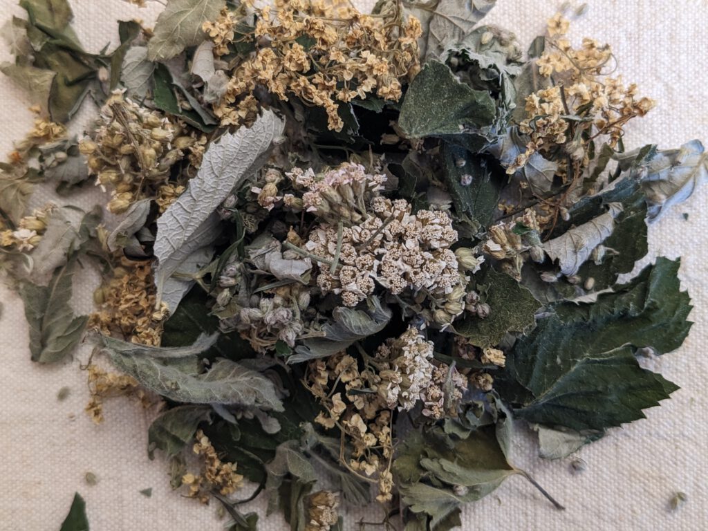 mit Himbeerblättern**, Samtminze*, Schafgarbeblüten**, Holunderblüten**,Frauenmantel*, Beifuß**